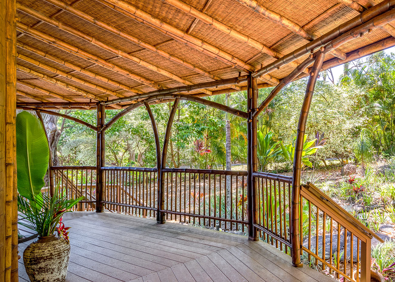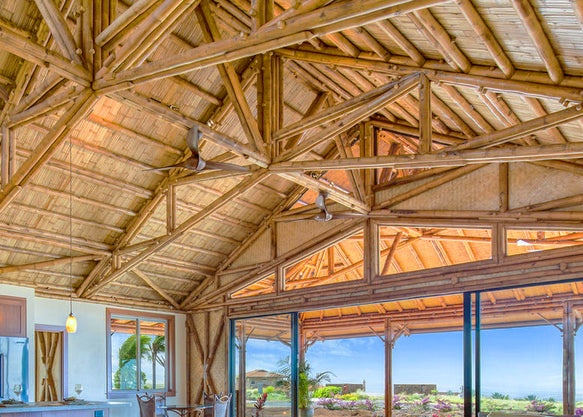 Our structural roof includes stunning bamboo trusses and structural roof panels. The interior of the panels are finished with the material of your choice—custom paint color, woven bamboo, or split bamboo (as shown above). The exterior of the panels is constructed with exterior grade plywood that is ready to receive the roofing material of your choice. (Roofing is NOT included in the building package.)