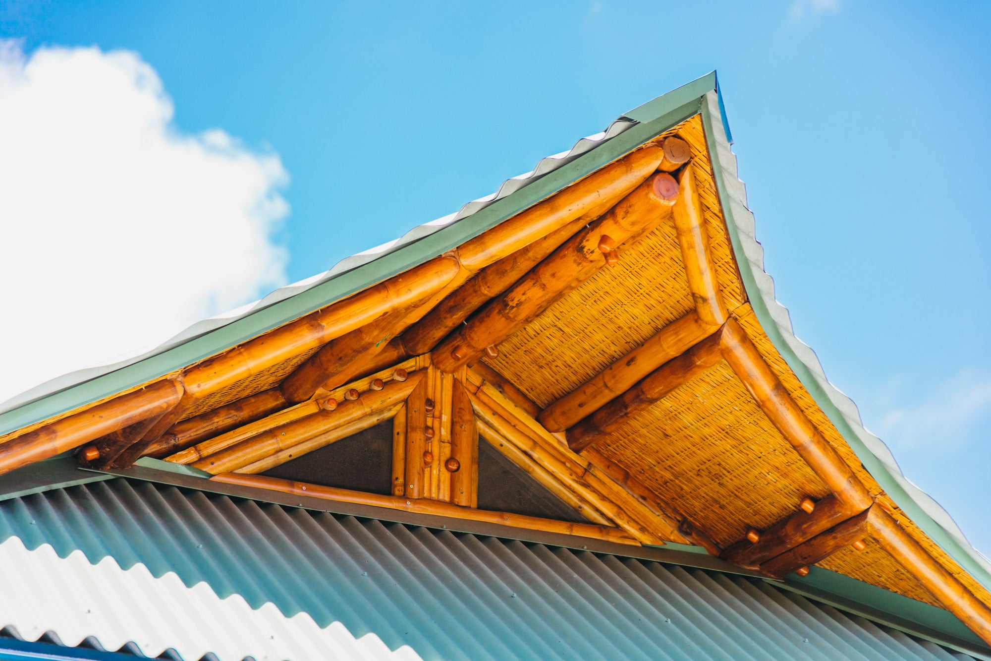 - Bamboo-framed roof support structure with sheathing