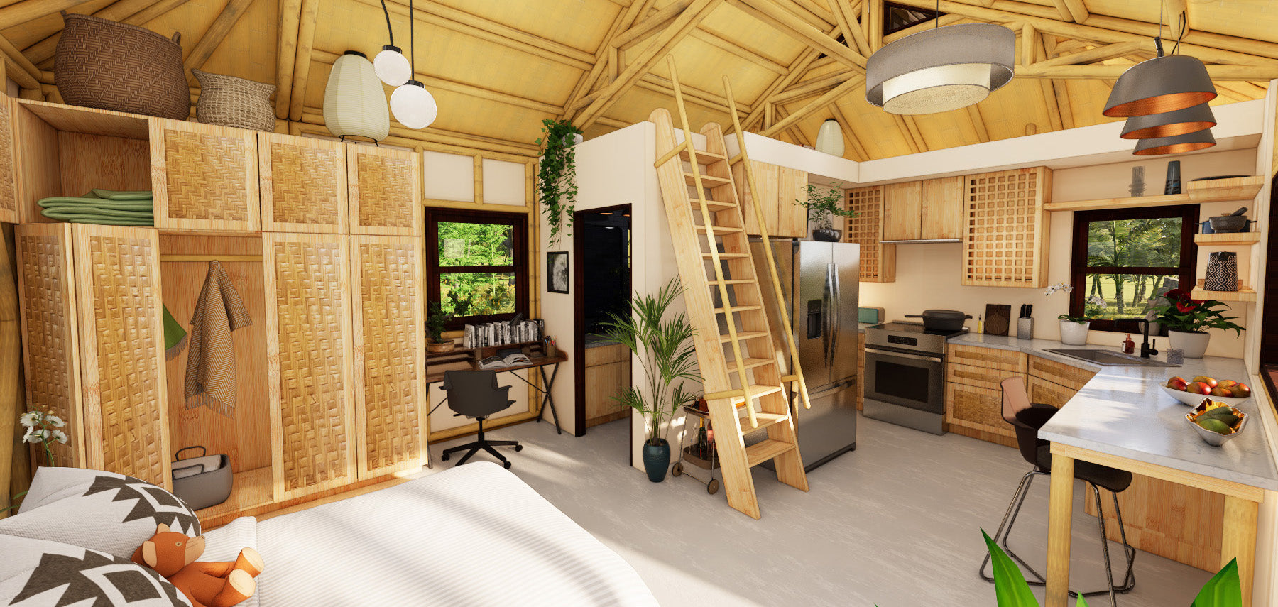 - Bamboo-framed walls if purchasing the Signature Kit (The Hybrid kit will NOT include bamboo walls, as the walls will be conventionally framed and built with locally sourced materials.)