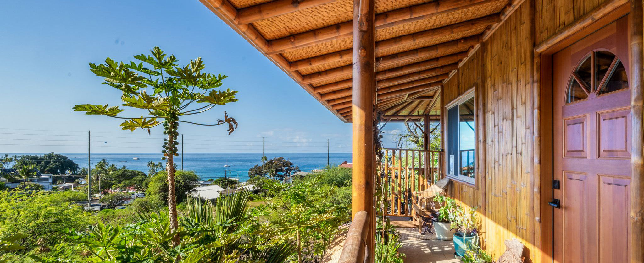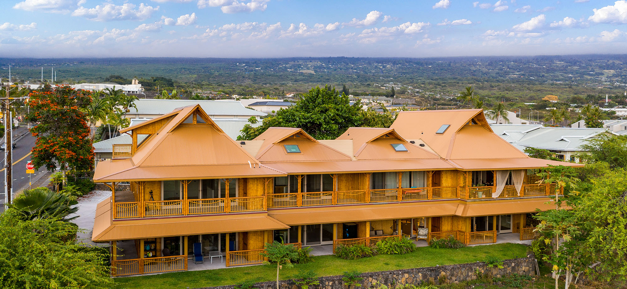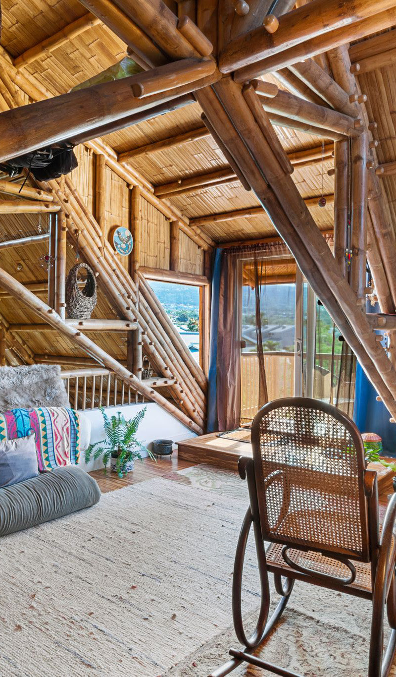 Bamboo Living has expanded into commercial design and just completed building its first multi-story multi-family project in Kona, Hawaii. The condominium project features 4 two-story bamboo buildings seamlessly designed together, creating ocean views for each unit while maintaining privacy between the 8 units. The building has a wrap-around porch with bamboo rafters extending above.