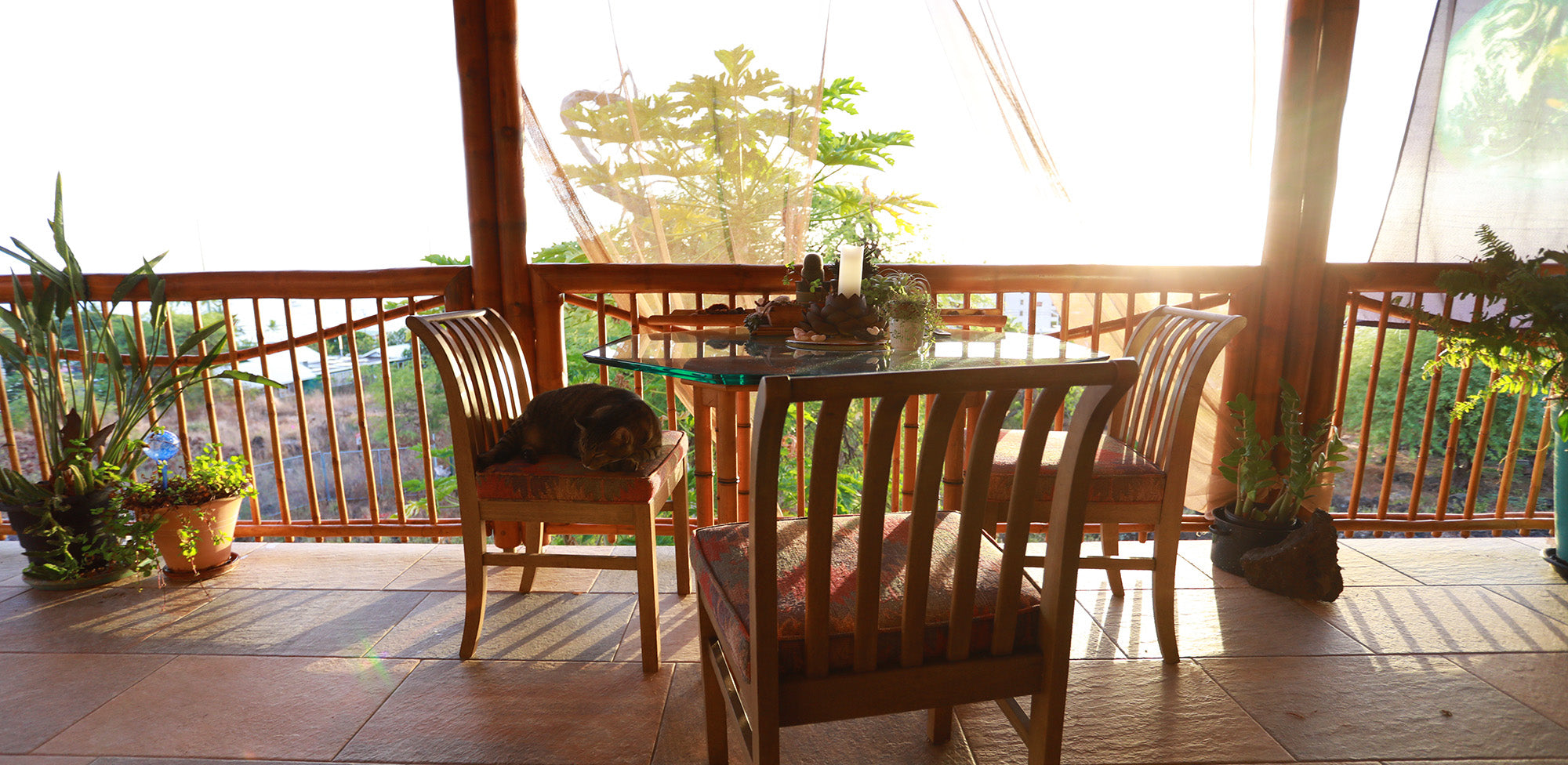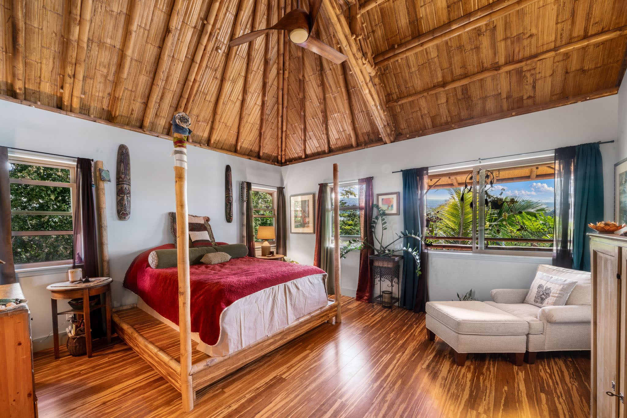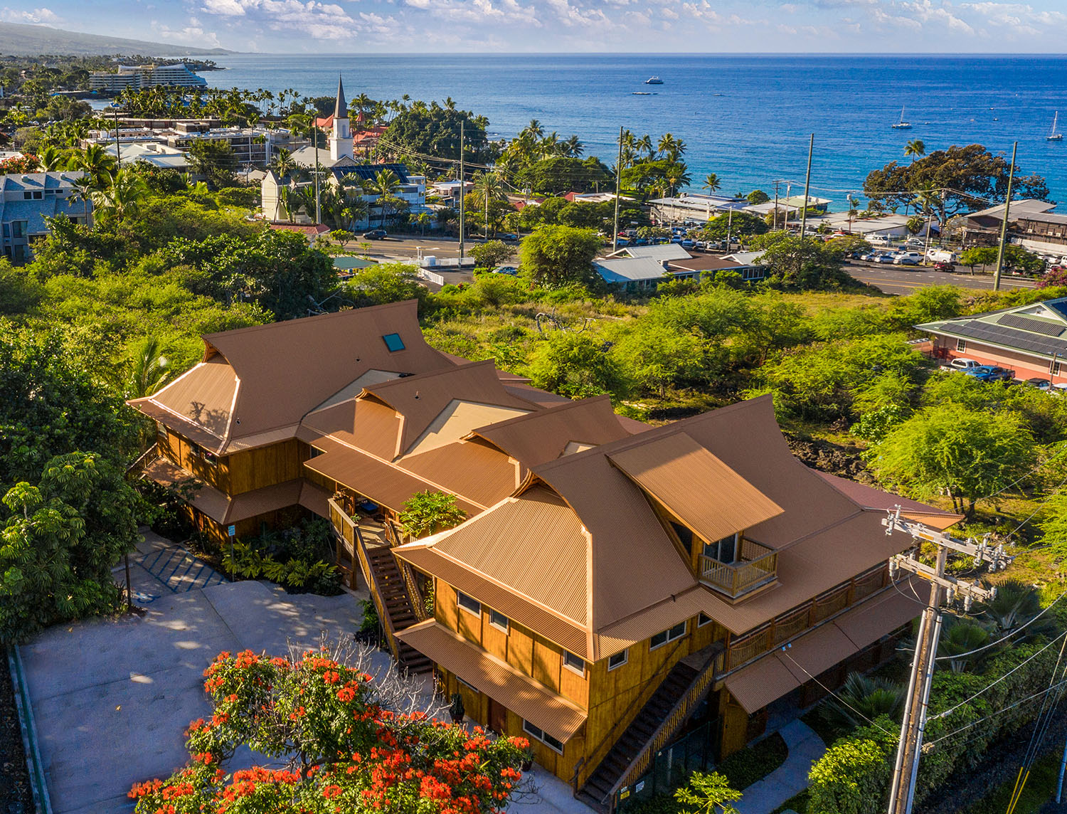 Bamboo Living has expanded into commercial design and just completed building its first multi-story multi-family project in Kona, Hawaii. The condominium project features 4 two-story bamboo buildings seamlessly designed together, creating ocean views for each unit while maintaining privacy between the 8 units. The building has a wrap-around porch with bamboo rafters extending above.